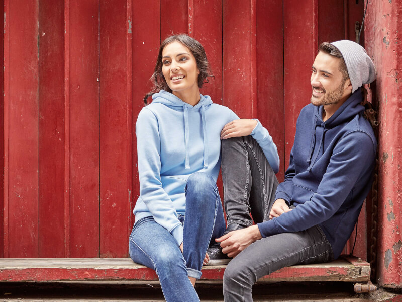 Dubbelsydd huva med platta matchade dragsnören och känguruficka. OEKO-TEX Standard 100-certifierad. Storlekar XS–XL i flera färger. Finns även som herrmodell.
