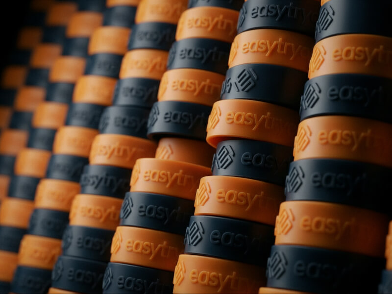 Notera att "tryck" är ett lager som ligger ovanpå banden och därmed efter en tids användning kan nötas bort. Vill du att din logo/design ska tåla all möjlig användning rekommenderar vi antingen nedsänkt tryck eller upphöjda, gjutna färger.